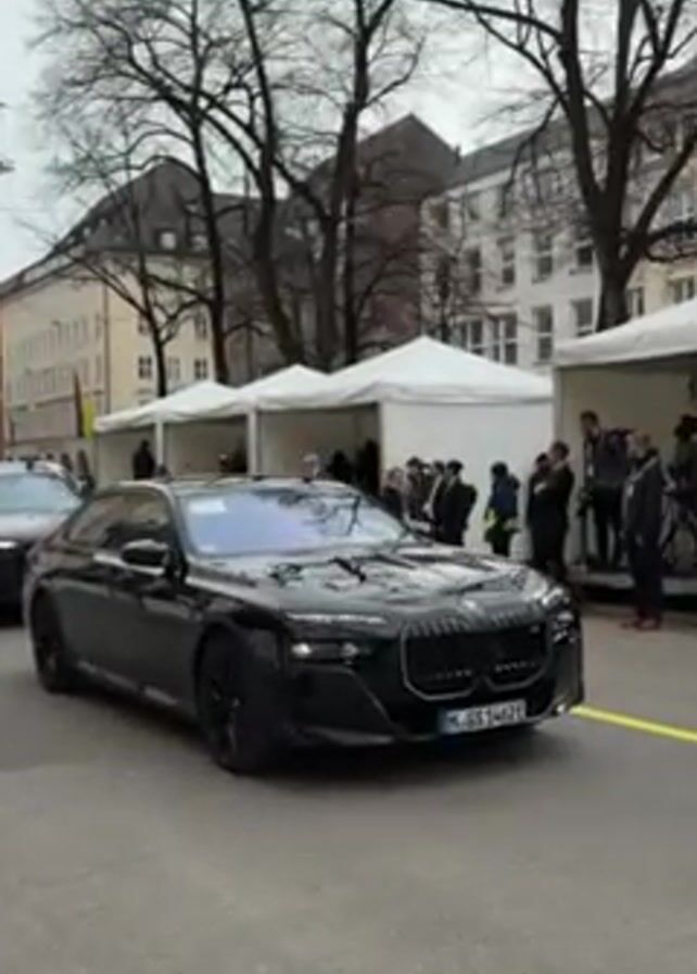 motorcade of black vehicles driving down a street in an urban setting. The first car appears to be a BMW, followed by several other black cars, including what appears to be an Audi SUV. People are standing on the sidewalks and near white tents set up on the side of the road. Some of the people are dressed in suits. The buildings are tall and appear to be located in Europe. The sky is overcast. Yellow and blue flags are visible on a building, suggesting support for Ukraine. A man in a suit is walking in front of the cars.
