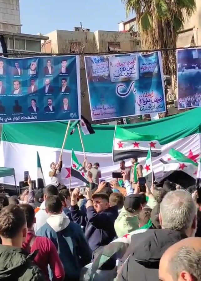 A crowd of people are gathered in what appears to be a public square. Most are waving Syrian flags. Banners with images of individuals are hung in the background. Many people in the crowd are holding their phones up, possibly taking videos or pictures of the event. The sky is blue, and there are buildings in the background, with a palm tree visible behind the crowd. Some of the flags are on poles, and the larger banners are supported by poles as well.