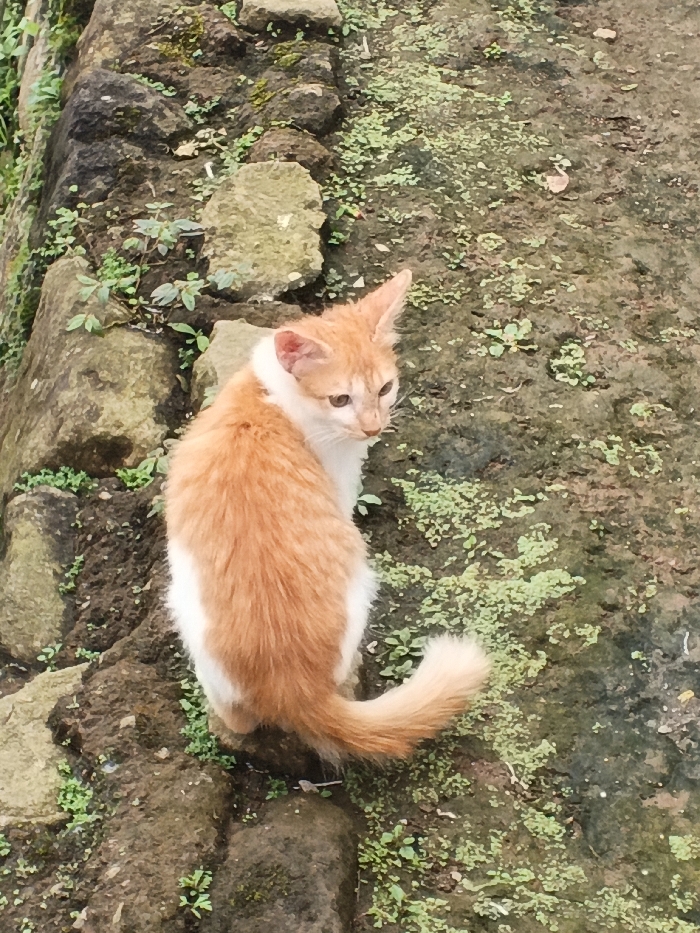 - "An orange and white cat sits amidst rocks and greenery" by FM-lI7Km1, licensed under CC BY 4.0