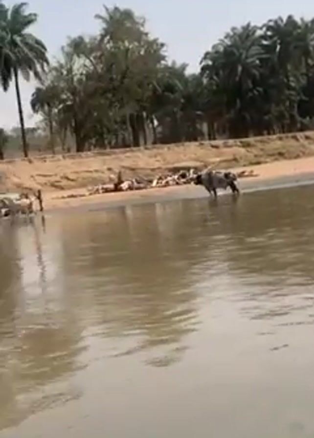 The video depicts a man wading through a river while holding a rifle. The water is murky brown. The man is wearing dark pants and a colorful shirt with an orange patch, and a headband or eye covering. He is walking toward the far bank of the river. In the background, there are several people and canoes. The riverbank is sandy and lined with palm trees and other vegetation. In later shots, a large herd of cattle is seen crossing the sandy bank by the river. The weather appears sunny and clear.
