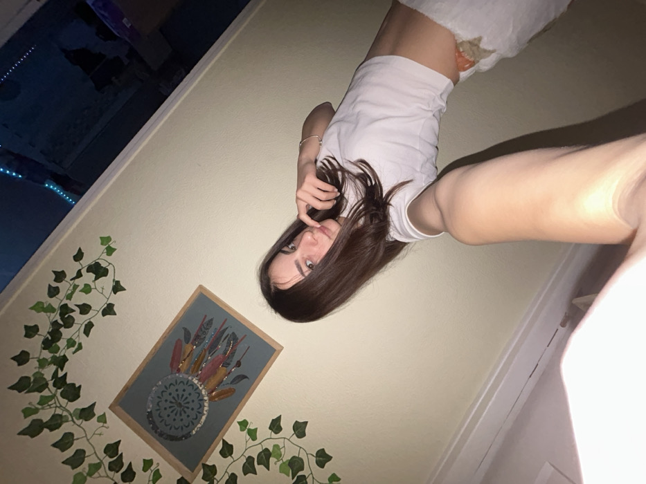 An indoor selfie is turned sideways. The subject, a woman with long, dark hair, looks at the camera, her hand near her face. She wears a white t-shirt and shorts. Behind her is a beige wall decorated with fake ivy and a framed picture. A dark space with LED lights is visible in the corner. The camera is close, distorting perspective and creating a bright glare on the right side.