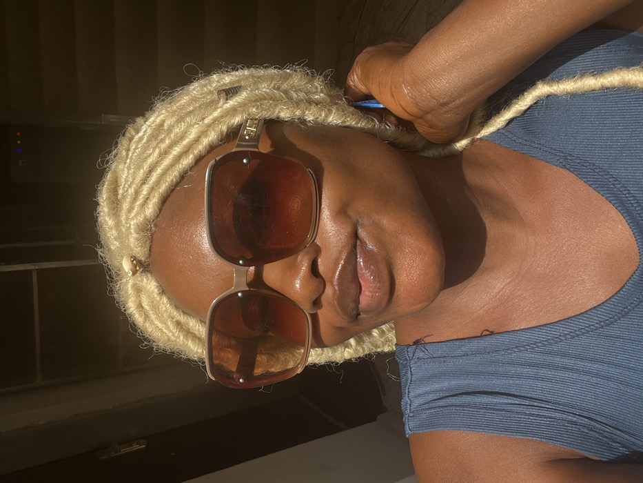 The image portrays an adult female individual, located in Gwarinpa, Nigeria, captured in a selfie-style photograph. The subject has dark skin and wears light blonde dreadlocks, accented by a small, light-colored bead or cowrie shell situated centrally above her forehead. She is wearing large, light brown-framed, square sunglasses with brown-tinted lenses and a dark blue ribbed sleeveless top. Her lips are glossy and slightly parted in a subtle smile. Her right hand (viewer's left) is raised, with fingers lightly resting against the side of her head and neck. Strong, directional sunlight illuminates the left side of her face, neck, and shoulder, casting distinct shadows across the right side. The background is largely underexposed, revealing a partial dark door frame with a visible handle on the upper left. On the upper right, a dark vertical structure contains three small, faintly illuminated points, appearing as red, blue, and green indicator lights.