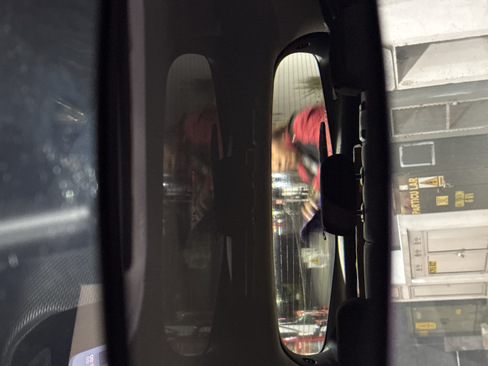 view through a vehicle's side mirror. In the reflection, a person wearing a red and black jacket appears to be interacting with a shopping cart. The background shows a store with shelves stocked with merchandise. A building with the partial word "PARTICULAR" and a yellow warning symbol is visible through the front windshield. There is no information in the image confirming the location.