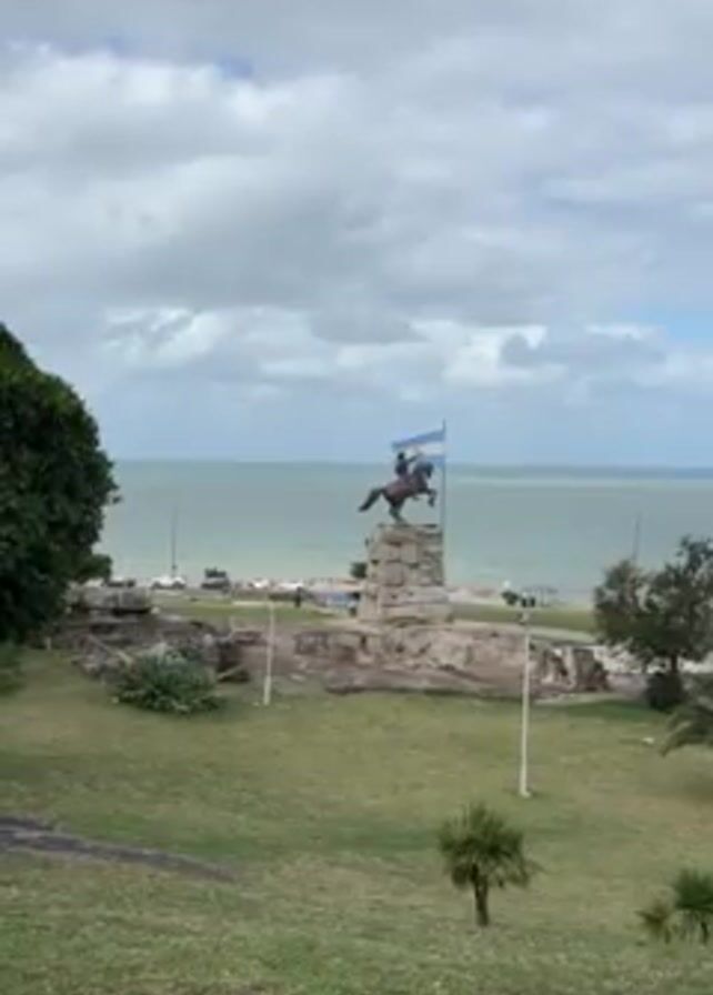 statue of a man on horseback with the flag of Argentina behind him, overlooking a body of water