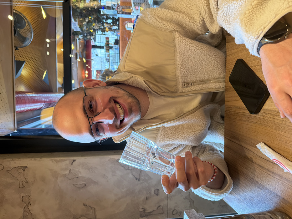 An indoor scene depicts a male subject seated at a wooden table in what appears to be a cafe or restaurant in Sofia, Bulgaria. The subject is a bald male, early to mid-30s, with short facial hair, wearing dark-rimmed eyeglasses. He is clad in a light beige fleece jacket with smooth panels on the shoulders and chest, over a lighter-colored top. He displays a broad smile, showing teeth. A red and white braided bracelet is visible on his right wrist, and a dark-colored smartwatch on his left wrist. In his right hand, the subject holds a clear, faceted glass tumbler containing water, filled approximately halfway. Resting on the wooden table to his left is a black smartphone, placed face down. A white, wrapped paper straw lies on the table to the left of his right hand. A portion of a beverage bottle is visible on the extreme left of the frame. The background to the subject's left features a textured, light-colored wall. To his right, a large window reveals elements of an urban or commercial interior, or reflections, including festive yellow string lights, a glimpse of an orange/red structure, and a partial view of a ceiling fan. The specific address or name of the establishment within Sofia is not discernable from the visual information.