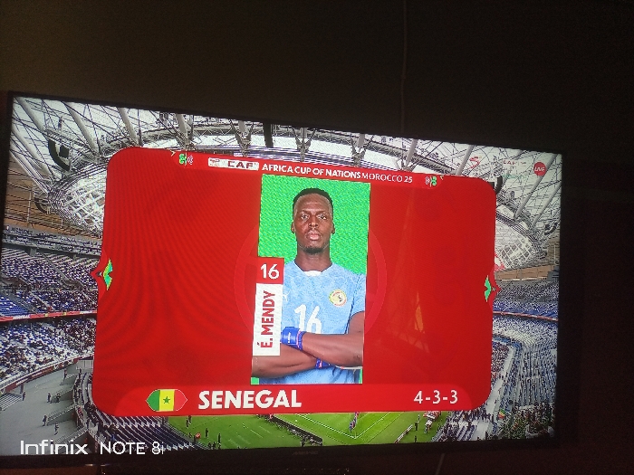 A wide-screen television, located in a dimly lit indoor environment within the city of Unknown, Unknown, displays a sports broadcast. The screen predominantly features a graphical overlay related to a football (soccer) match. This overlay includes a large red panel with rounded corners, showcasing a portrait photograph of a dark-skinned male individual identified as E. MENDY, wearing a light blue goalkeeper jersey with the number 16. His arms are crossed in the image. Text on the screen identifies the event as "CAF AFRICA CUP OF NATIONS MOROCCO 25", indicates the team "SENEGAL" alongside the Senegalese flag, and displays a "4-3-3" formation. A "LIVE" indicator is visible in the top right corner of the graphic. Behind the red panel, parts of a large, modern football stadium are visible, featuring multiple tiers of blue and white spectator seating and an intricate white roof structure. A green football pitch is partially observable at the bottom of the screen.