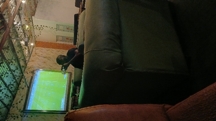 A blurry, tilted shot shows a man pouring a drink in front of a large, illuminated screen displaying a green soccer field. Metal latticework covered in greenery adorns the wall to the left, while a tan wall with windows stretches across the top. A large, green, heavily textured sofa dominates the right side of the frame, obscuring the view and adding to the sense of cramped space. A brown leather sofa extends across the bottom of the frame.