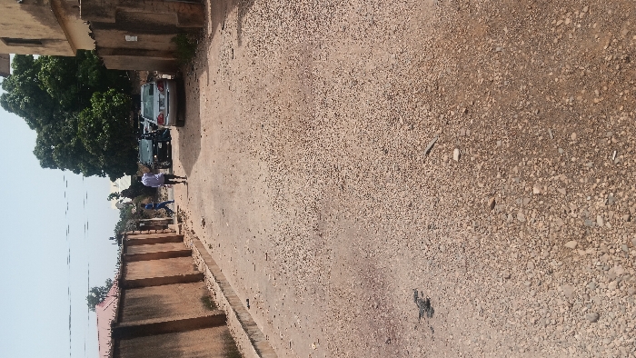 This image depicts an unpaved residential street in Jos, Nigeria, under bright daylight conditions