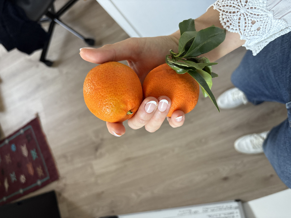 The image depicts an indoor scene in Saint-Ouen-sur-Seine, France, viewed from a high-angle perspective. The lower body of an individual is visible, dressed in blue denim jeans and white sneakers. The person's right hand, featuring French-tip manicured nails, holds two bright orange tangerines. One tangerine retains a small cluster of green leaves attached to its stem. The cuff of a white, possibly lace-trimmed, long-sleeved garment is visible on the right wrist. The flooring is composed of light-toned wood-grain laminate. In the background, a small, dark red rug with geometric patterns (light blue, brown) lies on the floor, and a partial view of a black office chair with wheels is seen to the right. A white vertical structure, possibly a wall or furniture edge, is present on the far left.