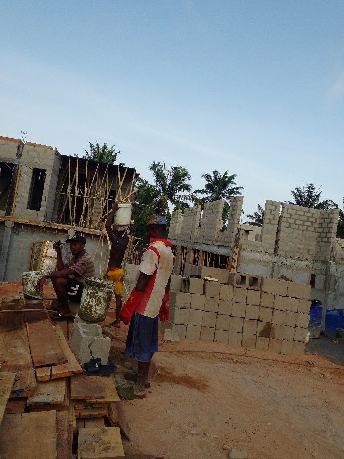 The image depicts a construction site in Alor, Nigeria, under a clear, light blue sky