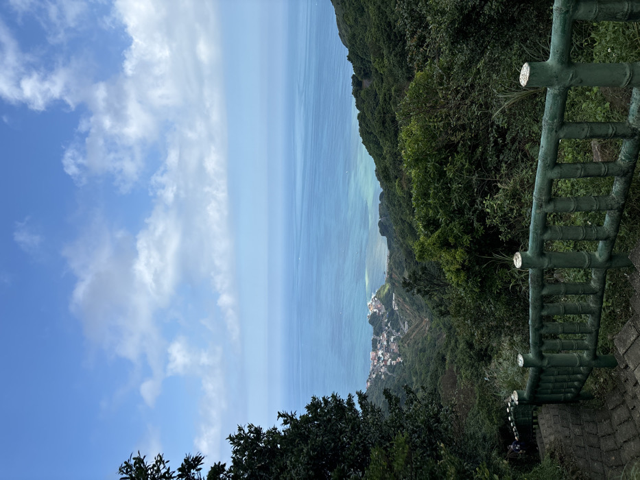 From a high vantage point, a view encompasses the sea, sky, and land. The sky presents a gradient of blues and whites with cloud formations. Below, the sea stretches out, exhibiting varying shades of blue, hinting at depth and distance. The coastline reveals a settlement with clusters of buildings. Lush greenery covers the steep terrain. The photograph is taken from a raised position along a path or structure, a segment of weathered green fencing runs alongside the path.