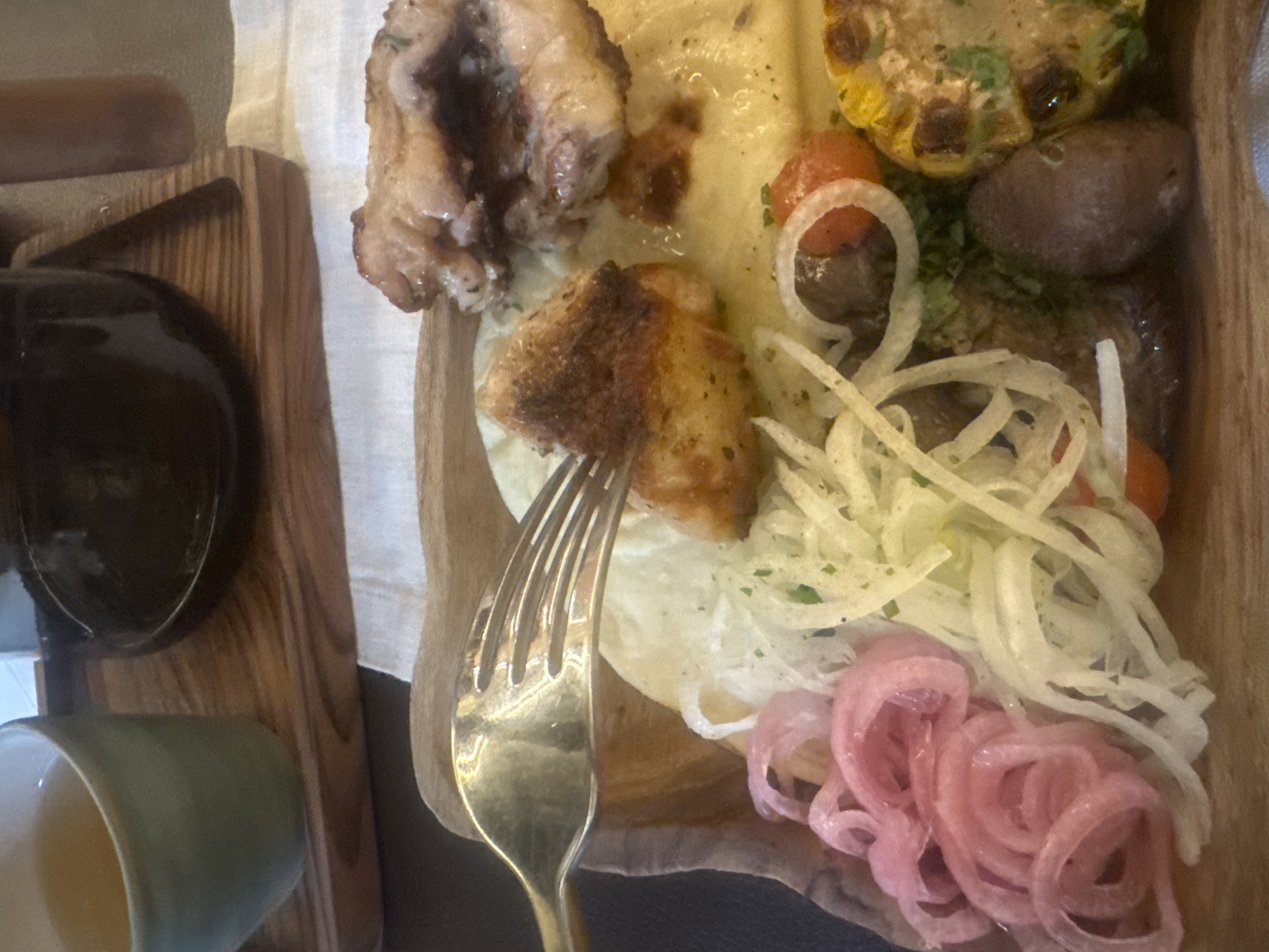 The image depicts a wooden platter of food, likely a mixed grill or barbecue assortment