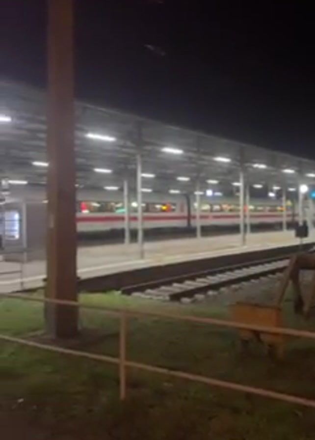 n exterior shot of a train station at night. The sky is dark, and the area is lit by the bright lights of the station. A white and red train is parked along the platform. A man wearing a dark jacket and hood walks near the edge of the platform. The ground is covered in grass and gravel.