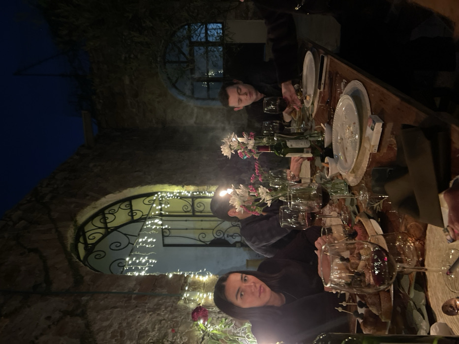 A nighttime gathering at an outdoor table reveals people amidst plates, wine bottles, and glasses