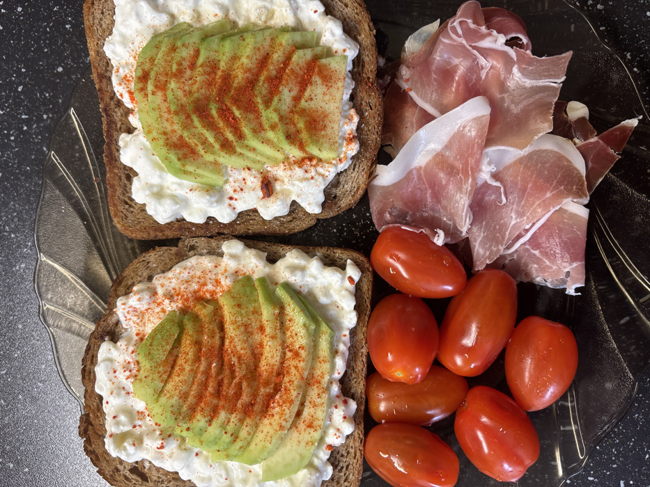 The image displays a meal arranged on a clear glass plate with a subtle decorative edge, positioned on a dark, speckled counter surface. Two slices of brown bread, prepared as toast, are topped with a generous layer of white cottage cheese, upon which thin, fanned slices of green avocado are arranged. Both avocado toasts are liberally sprinkled with red spice, consistent with paprika or chili powder. In the bottom left quadrant of the plate, a cluster of seven red, elongated cherry tomatoes, appearing freshly washed, is present. In the bottom right quadrant, a pile of thinly sliced, pale red cured ham with visible white fat edges is displayed. No individuals are depicted, and no specific environmental markers within the image provide an identifiable location in Sofia, Bulgaria.