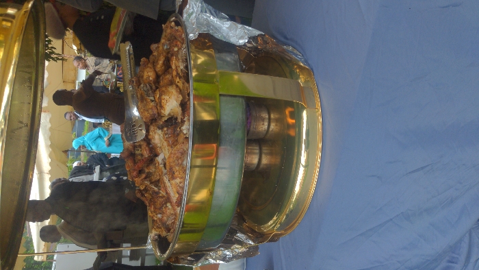 This image depicts an outdoor catering or buffet setup in Kondeni, Tanzania
