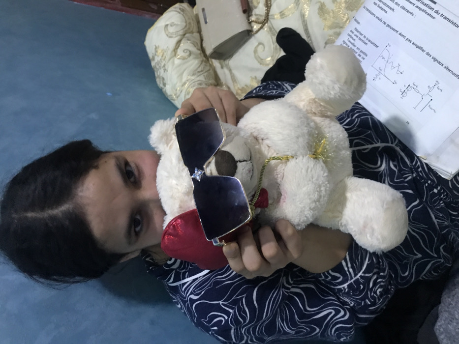 An individual with dark hair, wearing a dark blue and white patterned garment, is depicted indoors, partially obscured by a light-colored teddy bear held in front of their face. Their eyes are visible and directed towards the viewer. The teddy bear is equipped with dark, rectangular sunglasses featuring gold-colored frames and a star detail on the left lens. A small red heart is attached to the bear's left shoulder, and a gold-colored chain with a charm hangs from its neck. To the right of the individual, a patterned fabric, possibly a bedspread or cushion, in light and gold tones is visible, along with a beige handbag with a gold chain strap. An open book displaying French text and electrical circuit diagrams is also present on this surface. The background consists of a plain blue wall. The specific location within Ouislane, Morocco, is not visually identifiable from the image.