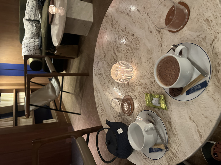 A round marble table displays tea service for two. A dark blue teapot sits near a white cup and saucer with a spoon and sugar packet. Nearby, a cup of hot chocolate rests on another saucer with a spoon, cookie, and sugar. A small glass sits on a coaster. A lit candle holder adds soft light. The table is next to a bookshelf and seating area.
