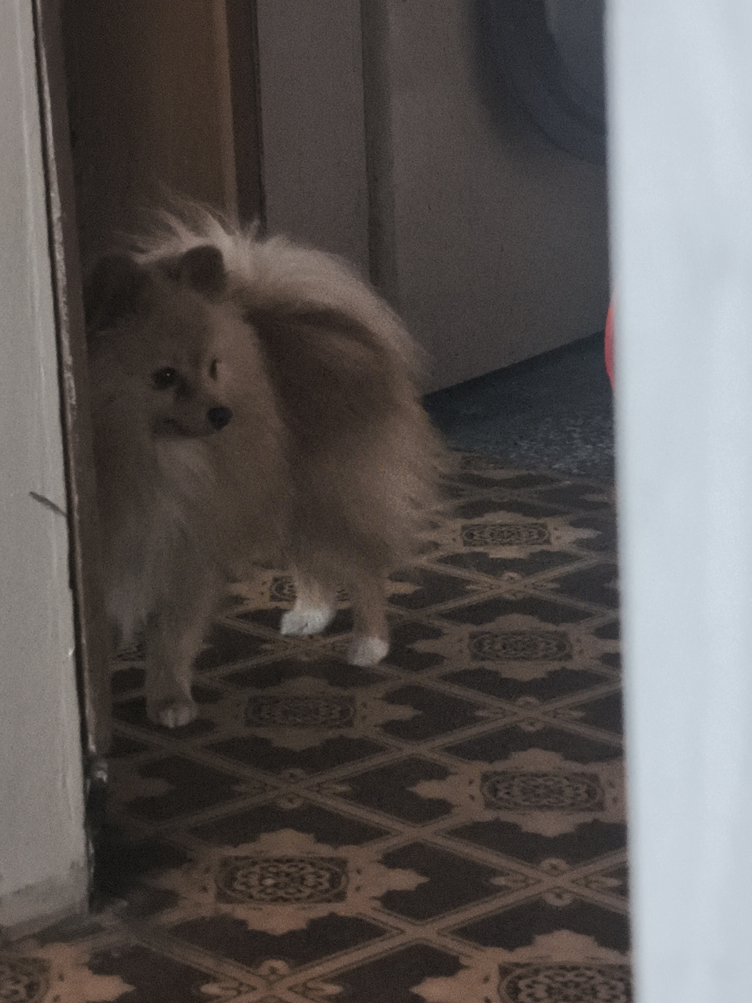 - "A tan, medium-sized dog with fluffy fur stands on a patterned brown and beige carpet" by FM-i1aDW2, licensed under CC BY 4.0