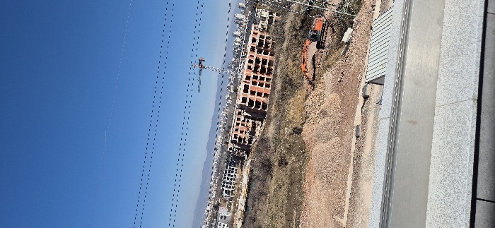 The image depicts an elevated view of an active construction site in Sofia, Bulgaria, under a clear, bright blue sky. In the immediate foreground, a textured gray concrete surface with a horizontal metallic railing spans the bottom of the frame, suggesting a vantage point from a balcony or similar structure. Beyond this foreground, the midground is dominated by large expanses of reddish-brown earthworks, including numerous piles of excavated soil and rubble. Two multi-story residential buildings, structurally advanced but lacking exterior finishes, are central to the scene. These buildings feature exposed brickwork and numerous unglazed window openings. To the lower right, an orange hydraulic excavator is positioned on a mound of earth, indicating ongoing excavation or material movement. A tall construction tower crane is visible further back, towards the right side of the frame, towering over the unfinished structures. The background reveals a densely built urban landscape of Sofia, characterized by numerous multi-story buildings. In the far distance, a prominent mountain range, consistent with Vitosha Mountain, rises against the horizon. Several dark, parallel power lines are visible traversing the upper portion of the clear blue sky. No individuals are present within the visible frame. The overall scene suggests significant ongoing urban development and expansion.