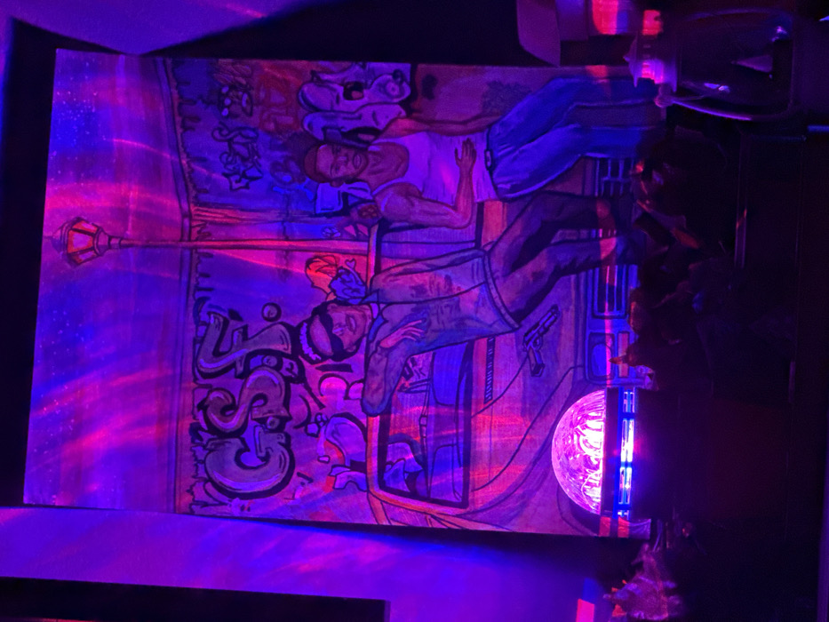 The image displays a vertically oriented artwork, likely a mural or large painting, illuminated by strong neon pink and purple/blue light, creating a vibrant, glowing effect