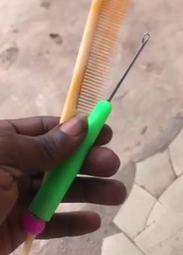 A dark-skinned hand holds a light yellow comb and a metal latch hook tool with a green handle and pink end