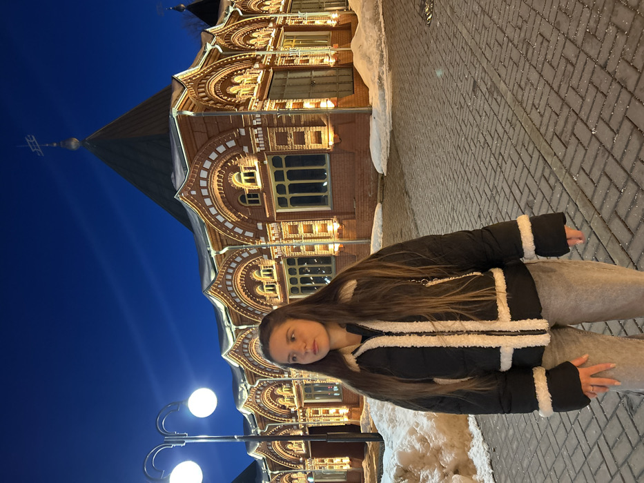 A young female stands outdoors at night in Klin, Russia