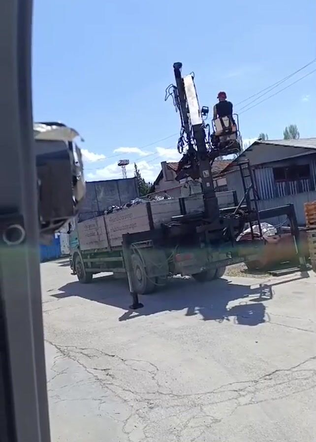 truck equipped with a crane loading bricks or concrete blocks, as viewed from inside another vehicle. A man wearing a red hat is operating the crane from a seat mounted on it. The truck is parked on a cracked concrete surface in an outdoor area, possibly a yard or construction site, under a bright blue sky with some clouds. In the background, there are buildings and vegetation, with the sun shining brightly.