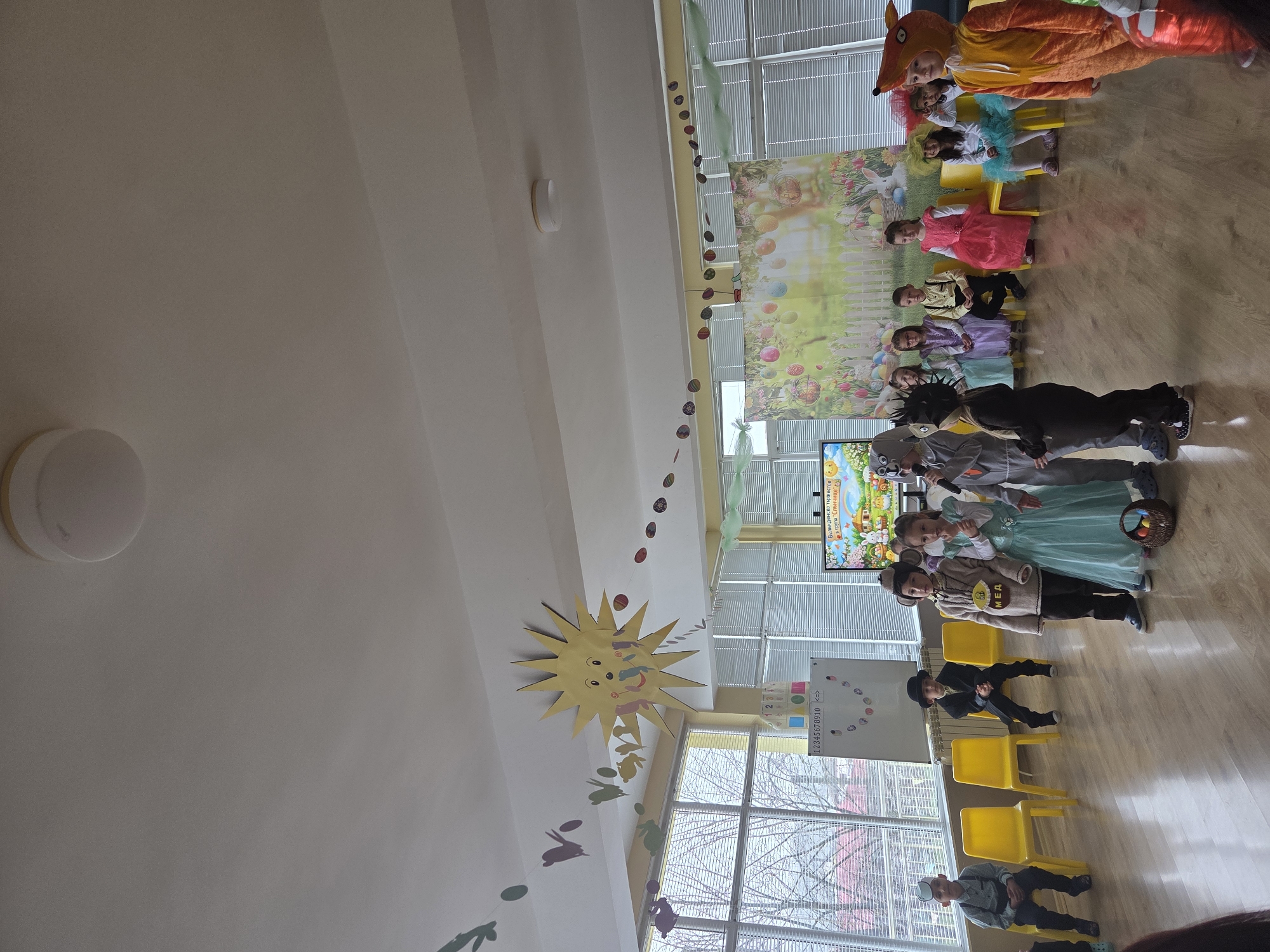 In a room in Oreshak, Bulgaria, children dressed in various costumes sit in yellow chairs. A large poster with Easter-themed decorations and text in Bulgarian hangs in the background. Windows with blinds and a whiteboard are also visible. The room is decorated with a sun-shaped decoration hanging from the ceiling, along with egg and bunny-shaped paper cutouts. The floor is a light wood.