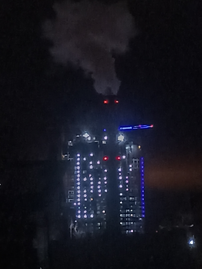 - "A nighttime scene depicts a multi-story urban structure with a large plume of smoke or steam rising from its upper sections" by FM-51ZAf2, licensed under CC BY 4.0
