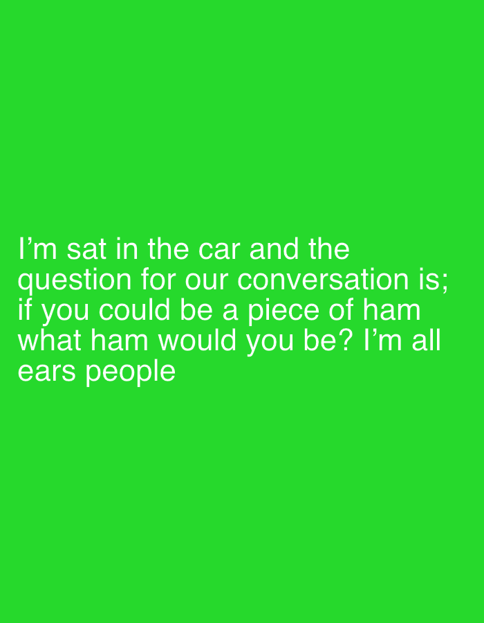 This image displays white text set against a solid, bright green background. The text, positioned towards the bottom of the frame, states: "I'm sat in the car and the question for our conversation is; if you could be a piece of ham what ham would you be? I'm all ears people". No individuals, objects, or specific environmental features are visually depicted within the image itself. The text implies the presence of a person seated in a vehicle, initiating a conversation with others. The conceptual location of this scene is Weymouth, United Kingdom.