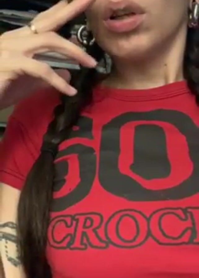 A woman with dark hair in braids is smoking a thin cigarette. She is wearing a red t-shirt with black text that says "60 CROC". She has silver hoop earrings and tattoos on her left arm. She appears to be indoors, as there is a shelf with items on it visible in the background.