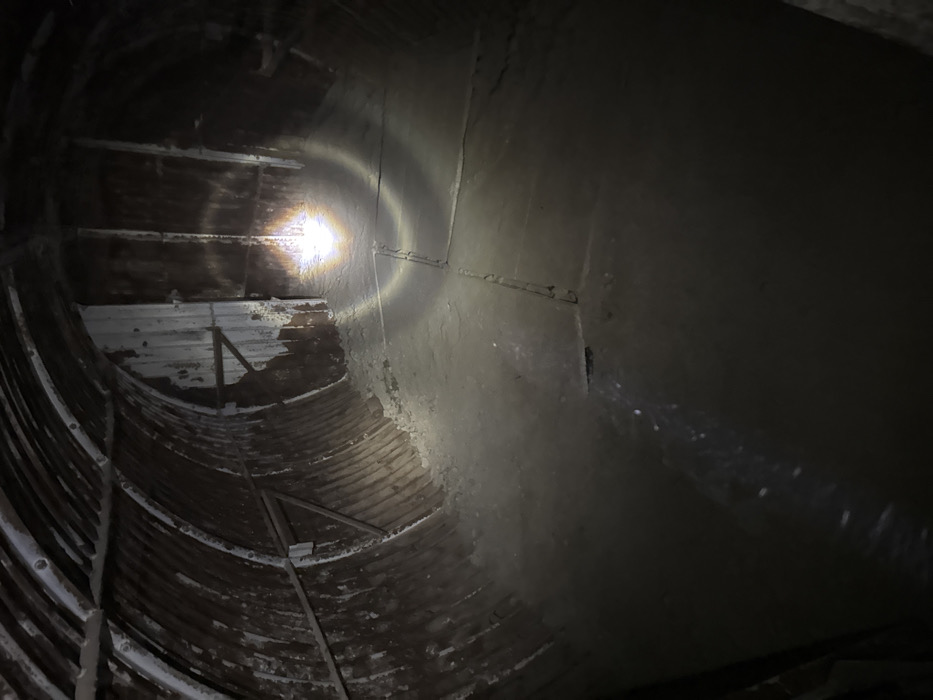 The image depicts the interior of a dark, cylindrical structure. The left side appears to be corrugated metal, exhibiting rust and deterioration. The right side is smooth, possibly concrete or painted metal. A bright light source illuminates the scene, creating a circular halo on the surfaces. The overall impression is one of neglect and decay within a confined space. Cobwebs are visible towards the lower right.