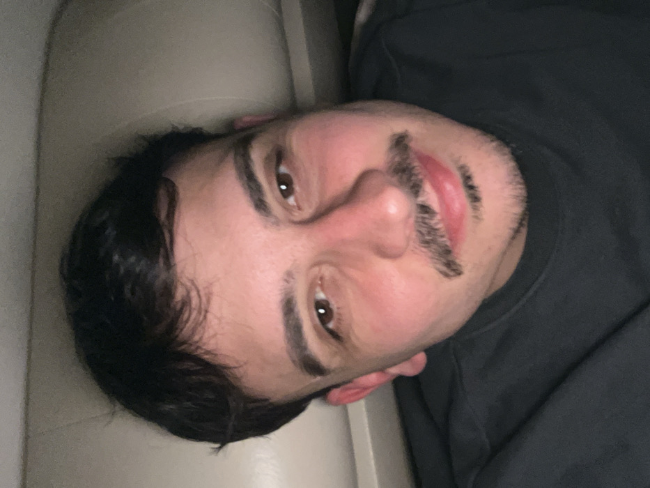 A close-up, head-and-shoulders portrait captured in the city of Plovdiv, Bulgaria, features a young adult male. He has dark, short hair, prominent dark eyebrows, and brown eyes. A dark mustache is visible above his closed lips, complemented by a short, dark goatee on his chin. His complexion appears fair with a slight flush on the nose and cheeks. The individual is wearing a dark-colored, possibly black or dark gray, crew-neck garment. He looks directly at the camera with a subtle smile. The immediate background consists of a light-colored, possibly beige or off-white, upholstered surface, suggesting an indoor setting or vehicle interior with subdued lighting.