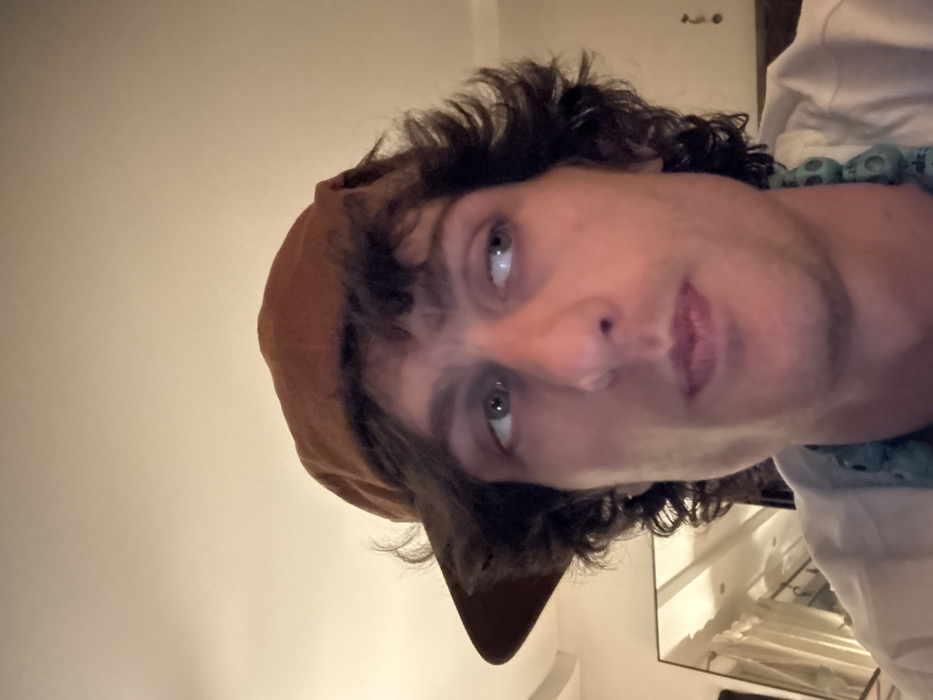 A close-up, tilted headshot of a person with fair skin, wearing a brown cap and white shirt with a turquoise beaded necklace. The person has wavy dark hair and light-colored eyes looking upward. A portion of a mirror and wall are visible in the background. The lighting is diffused. The image is slightly rotated, and the perspective is from below.