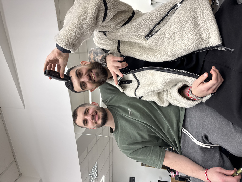 The image captures two young adult males posing in a barbershop located in Kazanlak, Bulgaria