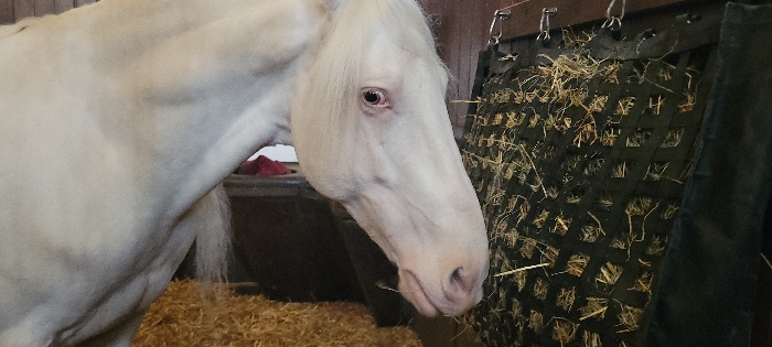 A white horse, its head turned to the right, eats from a black mesh hay feeder hanging in a stable. The horse has a pale pink nose and a soft gaze. The feeder is partially filled with hay. The stable floor is covered in loose straw. A black container is partially visible behind the horse's neck.