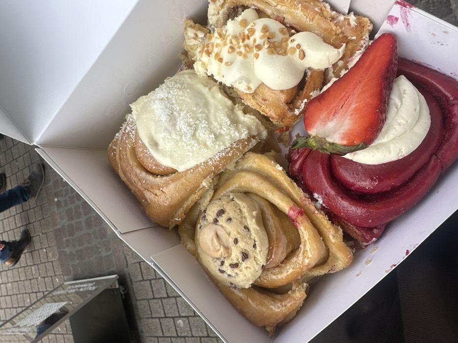 - "four cinnamon rolls in a white cardboard box, with a red-colored pastry with whipped cream and a strawberry on top" by FM-uds0f2, licensed under CC BY 4.0