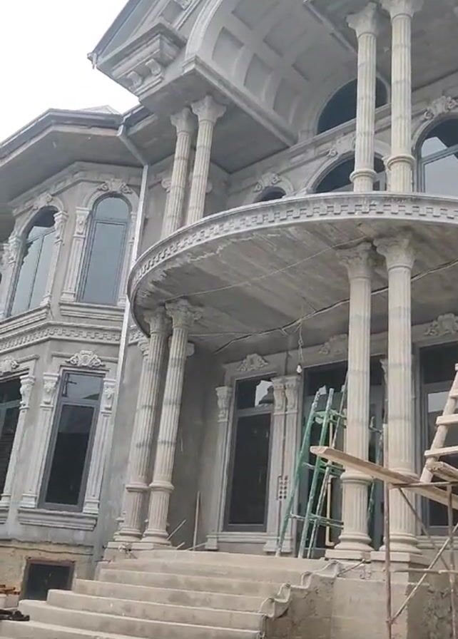 exterior of a large, unfinished building with neoclassical architectural features. The facade is mostly gray with white decorative elements, and there are several windows with dark frames. A prominent balcony supported by columns is visible above the entrance, which is accessed by a set of stairs. Ladders and scaffolding are present around the building, indicating ongoing construction or renovation work. No people are clearly visible in the frame. The sky is overcast, suggesting a cloudy day.