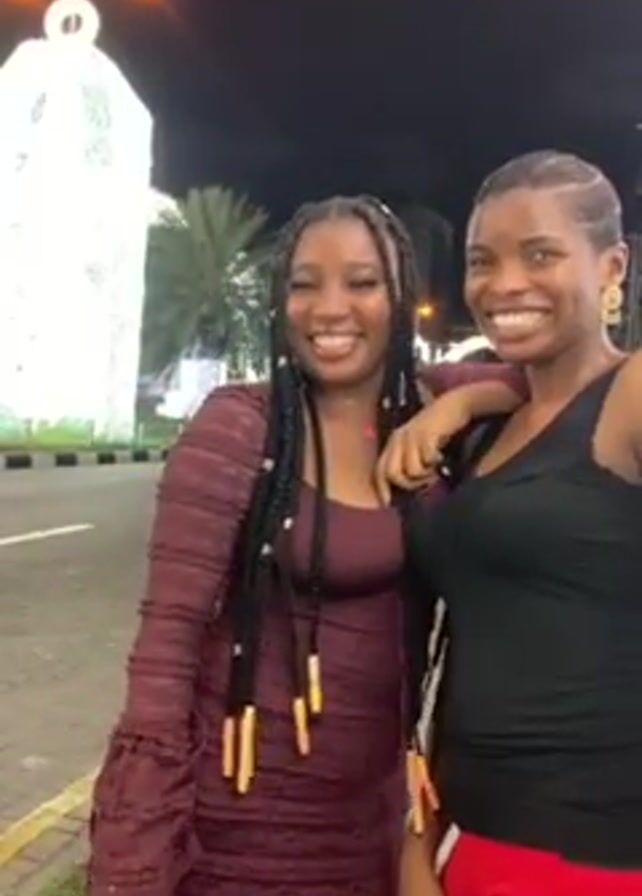 Two women stand side-by-side on a sidewalk at night. The woman on the left is wearing a burgundy dress with long sleeves and braids with blonde beads. The woman on the right is wearing a black tank top and red pants. She has short hair and gold earrings. The woman on the right has her arm around the other woman. They are both smiling. In the background, there is a large white structure lit up with lights. There are also some palm trees and streetlights. The woman on the right speaks and gestures, as if directing something to the person filming.