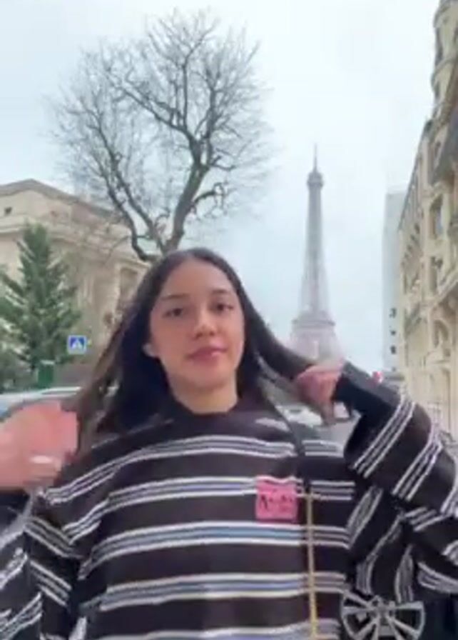 A young woman stands in front of the Eiffel Tower in Paris. The sky is overcast. She is wearing a striped sweater with the word PARIS in pink across the back. She is wearing blue jeans and a crossbody bag. There are buildings, trees, and cars in the background. She turns and smiles at the camera, then turns away to look at the Eiffel Tower. She puts her hair up in a ponytail.