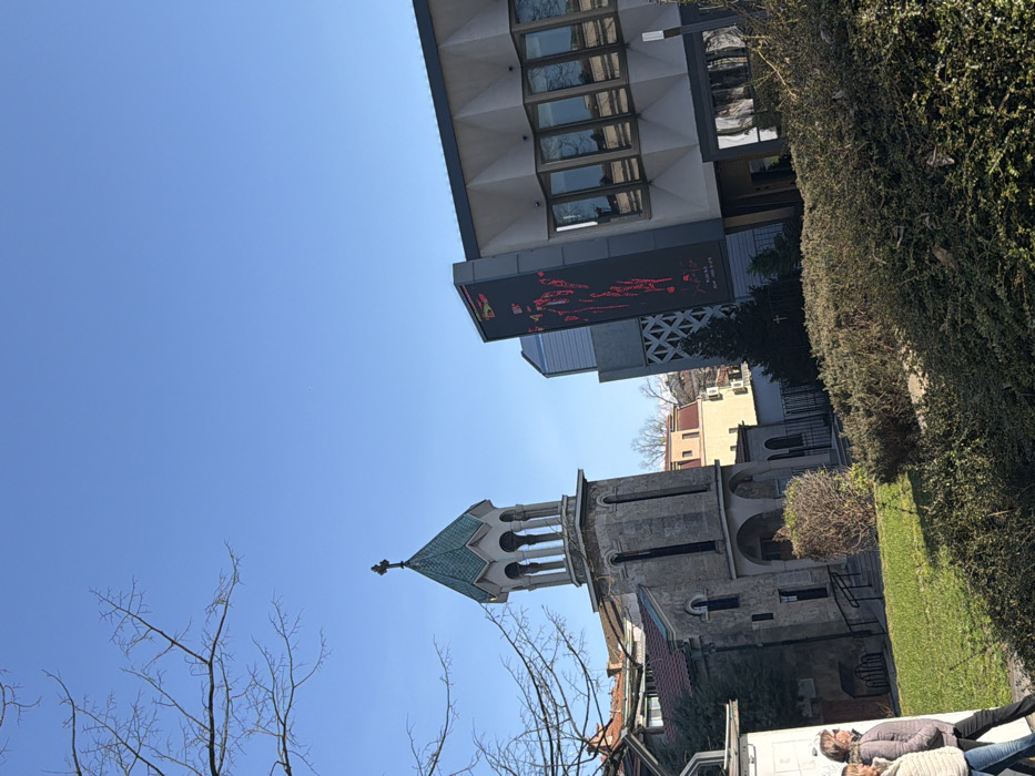 The image depicts an outdoor scene in Burgas, Bulgaria, showcasing the Armenian Apostolic Church "Surp Hach" and the adjacent Cultural Center "Sea Casino" under a clear, bright blue sky. On the left, the Armenian Apostolic Church "Surp Hach" presents a weathered stone construction, featuring a prominent bell tower with an open belfry, capped by a distinctive turquoise-green conical tiled roof surmounted by a black Latin cross. The main church structure behind it also displays stone facades and arched window/door openings. Steps lead up to an arched entrance. To the right, the Cultural Center "Sea Casino" is visible, a modern multi-story building characterized by a light-colored, geometrically patterned facade and several large, dark-framed windows on its upper section, reflecting the sky and distant trees. A tall, vertical LED display panel is affixed to the building's exterior, actively showing a red, abstract, digitally-rendered image. The foreground consists of a gently sloped area covered with short, green grass and various dark green, dense bushes and shrubs. Bare tree branches extend into the upper left quadrant of the frame, indicating a season outside of full foliage. A dark metal fence is partially visible behind the church, separating it from unseen structures. On the far left, two adult individuals are partially visible, walking from left to right. The person in the foreground wears a light-colored puffer jacket and blue jeans. The second individual, slightly behind, wears a brown or tan jacket and dark trousers. No specific interactions between them or with the environment are discernable. The scene is brightly illuminated by direct sunlight, casting clear shadows.