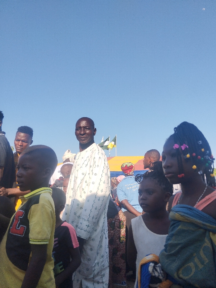 This image captures an outdoor scene in the city of Idon, Nigeria, under a clear blue sky. In the foreground, an adult male of African descent, bald and wearing a long, white traditional garment with dark patterns, stands facing the camera with a neutral expression. To his immediate left, a young boy in a yellow and black t-shirt with a red "L" graphic stands in profile, looking left. To the man's right, a young girl with braided hair adorned with colorful beads (pink, yellow, blue) wears a light-colored top and holds a blue and yellow patterned fabric, looking slightly left. A younger girl with braided hair and a white sleeveless top stands between the man and the first girl, also looking left. In the background, a crowd of people, some partially obscured, is visible. Elements such as green, white, and yellow flags and colorful tent-like structures can be discerned in the mid-ground. The individuals are standing, appearing to observe their surroundings within a group setting.