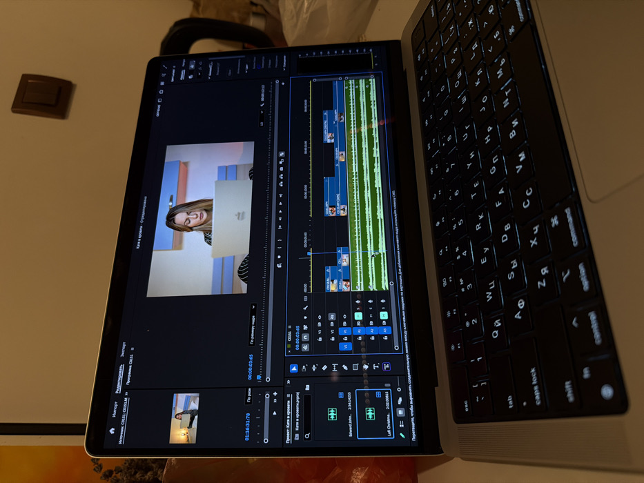 A laptop displays a video editing interface, likely Adobe Premiere Pro. The timeline shows various clips arranged on multiple video and audio tracks. The preview window shows a woman in front of a blue and white background. The laptop keyboard is visible with keys that have both English and Cyrillic letters. Text on the screen, partially in Russian, indicates project settings and file names. The overall scene suggests someone is in the process of editing a video.