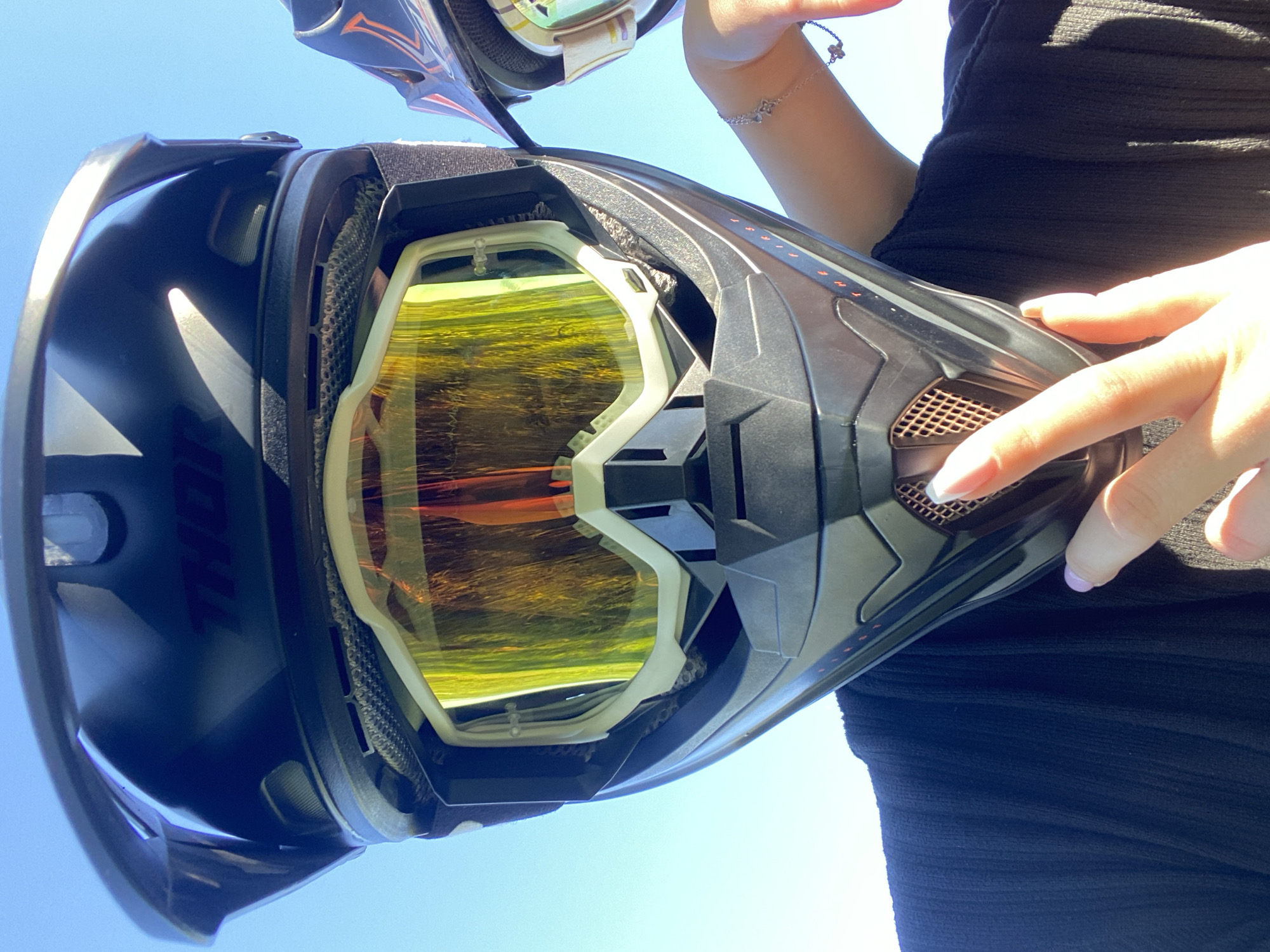 - "A black motocross helmet with yellow goggles is held in a person's hand against a clear blue sky" by FM-opJ3Q2, licensed under CC BY 4.0