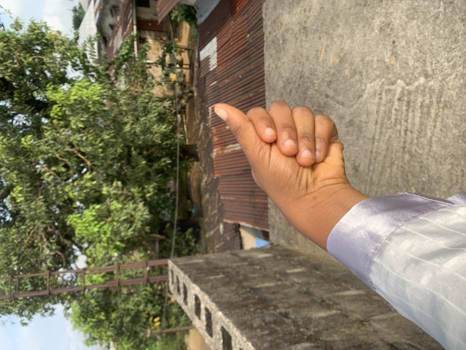 A right hand, extending from the bottom left of the frame, gives a thumbs-up gesture. The skin tone is medium-dark brown. The wrist is covered by the light grey cuff of a garment, which appears to be satin or a similar smooth, reflective fabric, possibly with subtle vertical stripes. The hand is positioned above a textured, light grey concrete surface, likely a rooftop or elevated platform. To the left, a concrete block wall with exposed hollow cells runs diagonally into the background. Beyond the immediate platform, the scene depicts an urban or semi-urban residential area in Anantigha, Nigeria. Below the concrete wall and platform, numerous corrugated metal roofs are visible, exhibiting various degrees of rust and weathering, ranging from dark brown to silvery-grey, with some patchwork. Large, leafy green trees dominate the mid-ground and background, partially obscuring other structures. Several low-rise buildings with light-colored walls and dark window/door openings are visible amongst the foliage and below the tree canopy. The ground level beneath the trees and buildings appears to be bare earth. The sky is bright and appears to be clear or lightly overcast.