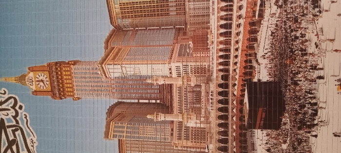 This image depicts a bustling religious scene, located in the city of Meknes, Morocco. In the lower half of the frame, a massive crowd of individuals, many dressed in light-colored attire, is observed in a vast, light-colored open plaza, engaged in circumambulation around the central Kaaba. The Kaaba is a prominent, dark, cube-shaped structure draped in black cloth with golden calligraphic embroidery. Surrounding this central area are multi-tiered structures featuring numerous arched walkways. Dominating the upper background is a complex of modern high-rise buildings, with the distinct Abraj Al-Bait Clock Tower standing tallest, characterized by its golden spire and a large clock face displaying Arabic numerals. Two slender minarets are also visible at the base of the taller buildings. The sky above is clear blue, indicating daylight conditions. Arabic text is partially visible at the very top of the image.