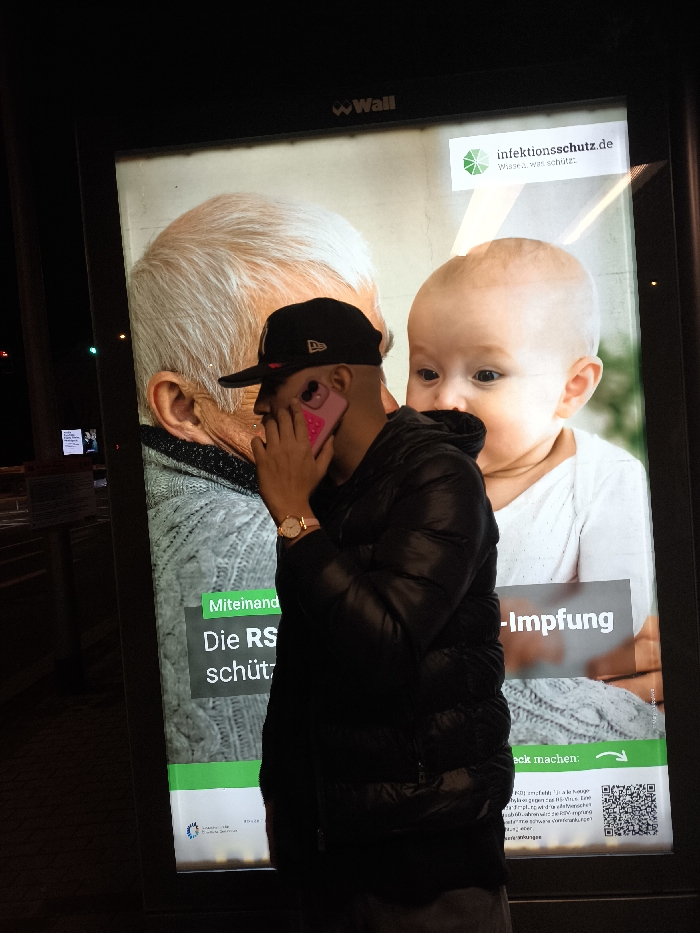 The image captures a nighttime street scene in Dresden, Germany. A male individual stands in the foreground, directly in front of a brightly illuminated, vertically oriented 'Wall' brand outdoor advertising display. He wears a dark-colored baseball cap, a black quilted puffer jacket, and a gold-toned watch on his left wrist. His right hand holds a pink-cased smartphone to his right ear, indicating he is engaged in a phone call. The billboard behind him features a German public health advertisement. It displays "infektionsschutz.de" and "Wissen. was schützt." at the top right, and prominently features close-up profiles of an elderly person's head on the left and a baby's head on the right. Green banners contain partial German text, including "Miteinander", "Die RS", and "-Impfung", which relates to an RSV vaccination campaign. A QR code is visible in the lower right, alongside a logo for a German federal health agency in the lower left. The ambient environment is dark, with the billboard serving as the primary light source.