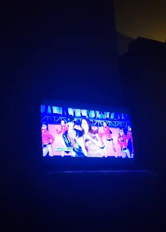 television screen in a dark room. The screen displays a music video or performance with a male and female singer in the foreground, backed by dancers wearing red outfits. The lighting on the screen is bright and colorful, contrasting with the dark room.