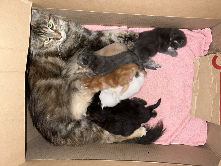 Inside a utilitarian cardboard box, serving as a makeshift nesting area in the city of Rusanovo, Russia, a domestic tabby cat with long, multi-toned fur (brown, grey, black) and striking green eyes lies on her left side, facing the viewer. She is actively nursing a litter of at least six newborn kittens. The kittens are clustered around her underside, suckling. Their fur colors vary: two are black, one is white, one is orange, and two are grey, with one appearing slightly lighter in shade. The bottom of the cardboard box is lined with a folded, light pink terrycloth towel, providing a soft surface. A smaller, folded piece of cardboard is partially visible beneath the towel in the lower central portion of the box. The environment is contained within the box, with light brown cardboard walls visible on three sides. No human subjects are present.